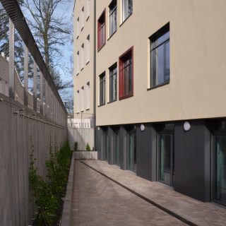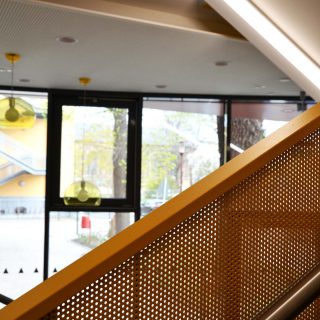 Der Neubau fügt sich trotz der modernen Formensprache in seiner Kubatur und Farbigkeit in das Gesamtensemble des Schulgebäudes ein. Das eingeschossige Foyer soll Aufenthaltsmöglichkeiten bieten und in seiner Farbigkeit den neuen Zugang zur Grundschule markieren.