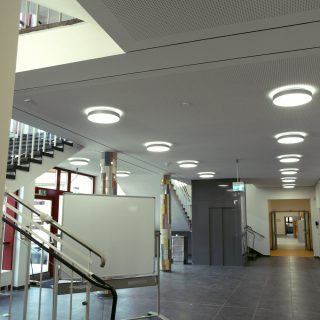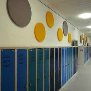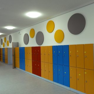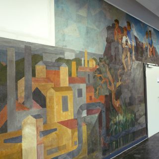 Das Schulgebäude wurde in den 60-ziger Jahren errichtet und steht mit seiner Wandmalerei und dem Foyer- und Treppenhausbereich unter Denkmalschutz.