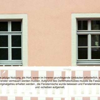 Komplettsanierung des vor 1608 errichteten denkmalgeschützten Gebäudes und Umbau zum Hort der Grundschule „Marie Curie“ in Dohna. Das Gebäude beherbergte seit seiner Errichtung viele Nutzungen von Gaststätte über Kino, Kindergarten und Wohnhaus und musste daher mit viel Feingefühl und baulichem Aufwand auf die ursprüngliche Form zurückgebaut werden. Zeitzeugen, wie das Relief des Goldenen Hirsch an der Fassade, die an die Gaststättennutzung um 1900 erinnern wurden restauriert, Stiltüren und -fenster aus Holz nach historischem Vorbild eingebaut und die Fassaden mit Gesimsen und Gewänden gemäß den Vorgaben des Denkmalschutzes saniert. Durch Einbau eines Aufzuges und Anbau einer Fluchttreppe erfüllt das historische Gebäude die heutigen brandschutztechnischen und barrierefreien Kriterien.
